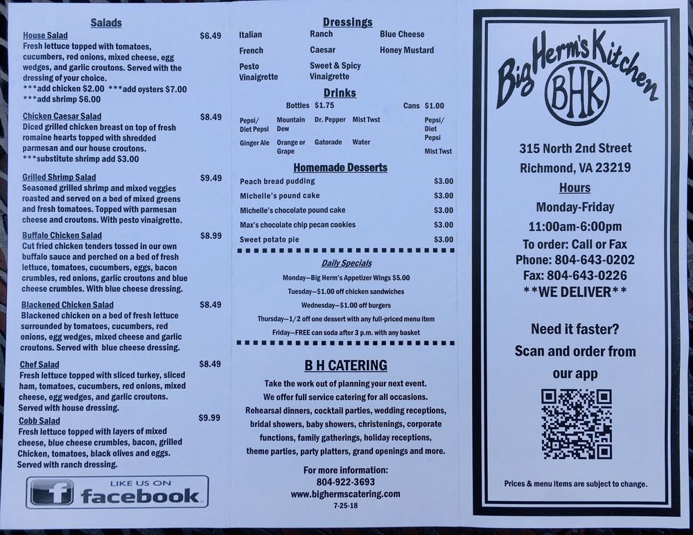 Big Herm's Kitchen, a Southern-Salad-Sandwich restaurant located in Richmond, VA, offers a diverse menu with options for everyone. Customers rave about the delicious salads, wings, and desserts like peach bread pudding and chocolate-pecan cookies. The portions are generous, the food is fresh, and the flavors are outstanding.